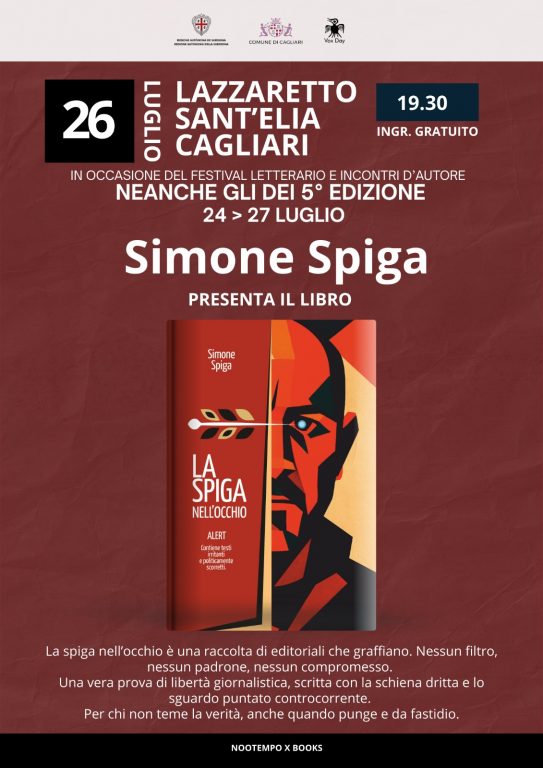 Sabato 26 Luglio il giornalista sardo Simone Spiga presenterà ufficialmente il suo libro “La Spiga nell’occhio” ( edito da nootempo x books ) a Cagliari, Lazzaretto Sant’Elia alle 19.30 con ingresso gratuito.