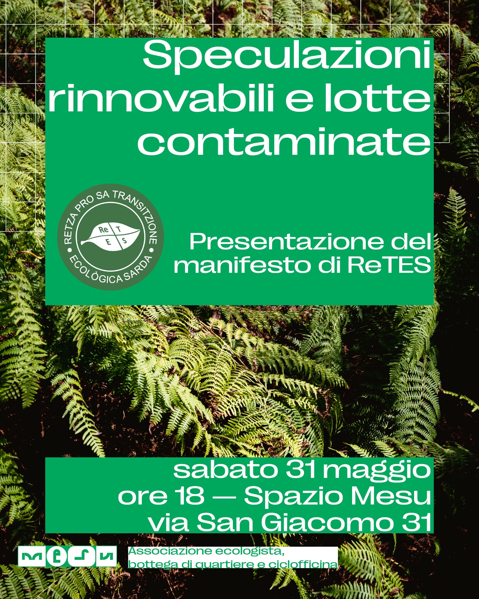 Negli scorsi mesi ReTES ha organizzato delle assemblee pubbliche a Sassari e a Cagliari, accompagnate da un lavoro online che ha coinvolto anche diversi expat, giovani sardi che vivono in Italia e all’estero. Il risultato è un manifesto intitolato «La transizione ecologica, fatta bene». La proposta è quella di una decarbonizzazione rapida e radicale, che chiuda al più presto la partita con carbone, gas e petrolio e che faccia spazio alle rinnovabili – compreso l’eolico su terra e mare, di cui molto si parla nell’isola. Una transizione gestita non dal mercato ma dalle comunità «perché siano i sardi e le sarde, e non le grandi aziende, a decidere dove installare gli impianti, e soprattutto perché i profitti vadano ad abbassare le bollette a migliorare il welfare». Il manifesto (disponibile qui) verrà presentato per la prima volta al pubblico il 31 maggio 2025 a Cagliari presso lo Spazio Mesu, che ha supportato l’iniziativa, nel corso di un evento intitolato «Speculazioni Rinnovabili e Lotte Contaminate». L’appuntamento è alle 18:00 in Via San Giacomo 31: in programma i saluti di ReTES e di Spazio Mesu, l’esposizione del manifesto e i collegamenti con alcuni attivisti all’estero, che intrecceranno il tema della transizione con quelli della guerra e del riarmo.