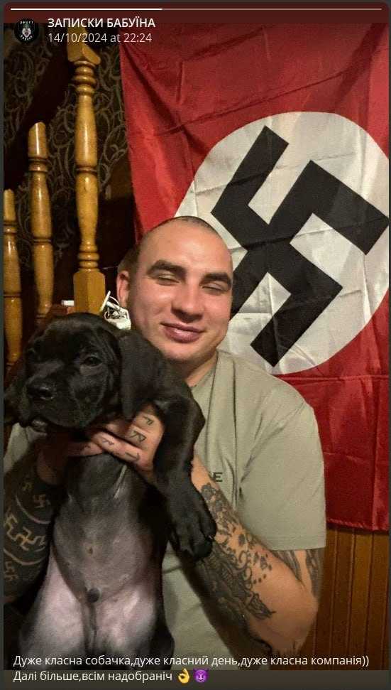 Ora è spuntata fuori una foto (caricata sul canale Telegram del combattente di Azov), ove il giovane estimatore della “mitologia scandinava” sorride con dietro in bella mostra una bandiera che non sembra essere quella legata alla Scandinavia ma forse di più al nazismo tedesco.