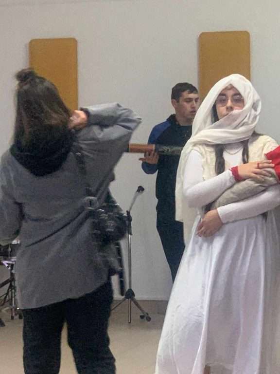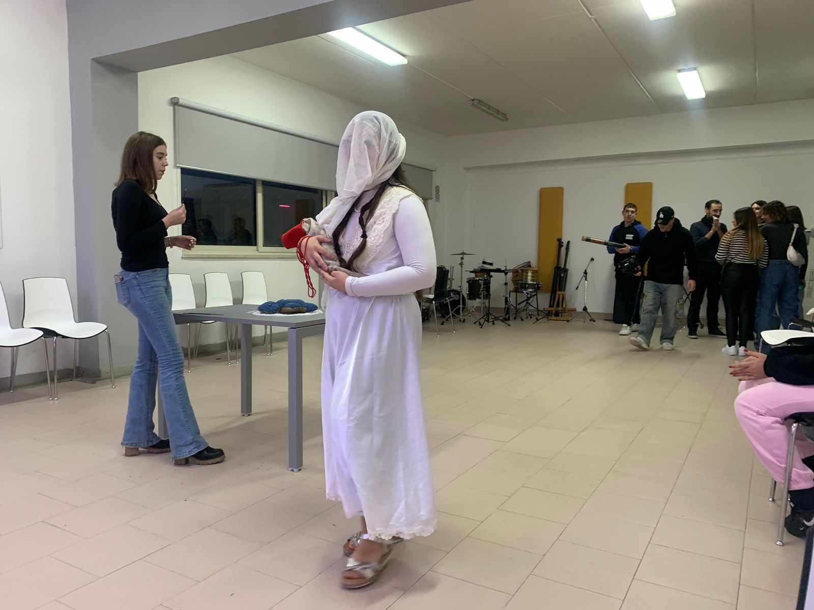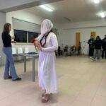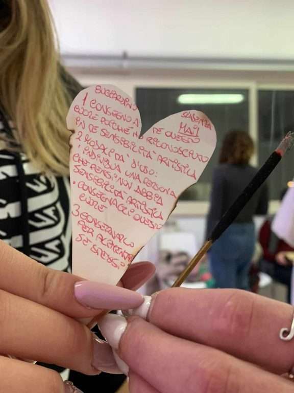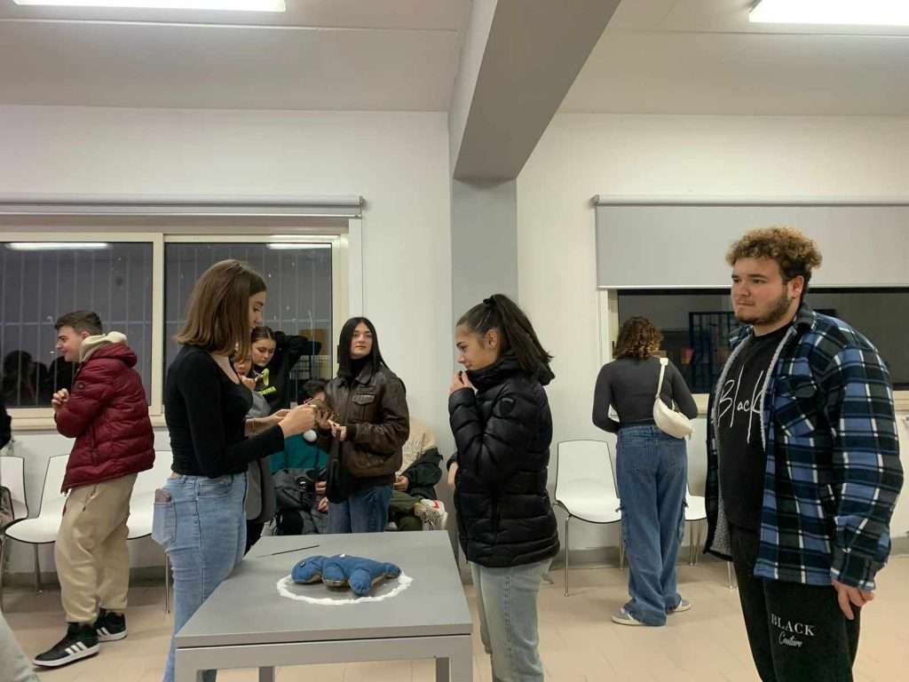 Al Liceo Artistico Don Lorenzo Milani, il principale Liceo dell’area Napoli Est, coordinati dalla Storica dell’Arte e Archeologa Simona Speranza, dall’artista Veronica Vecchione, dalla fotografa Francesca Piano e dall’artista media integrato Davide Esposito Adinolfi, per due ore ci si è confrontati con le diverse possibilità espressive dell’arte contemporanea, adibendo una stanza a spazio performatico aperto, spazio dove si è lavorato per sensibilizzare chi vi entrava, sull’arte come fondamenta dell’umana sensibilità, quattro erano le performance che si muovevano in sincrono: Dobreanu Antonella, con la sua performance, ha inscenato un rituale di purificazione e iniziazione all’arte, con incensi, sali e un pupazzo metafora del gesto che veniva eseguito a delimitare una protezione. Sabrina Terracciano, si è calata nei panni della classicità, facendo riflettere lo spettatore nel suo sentire sotto attacco permanente i suoi cardini (“compostezza, armonia ed equilibrio”). Antonio Silvestrini, ha fatto invece riflettere sull’importanza del ritratto dalla prospettiva di visione dell’osservatore, che dovrebbe comprenderne la qualità soggettiva distante dalle omologate visioni, e rappresentazioni da selfie.