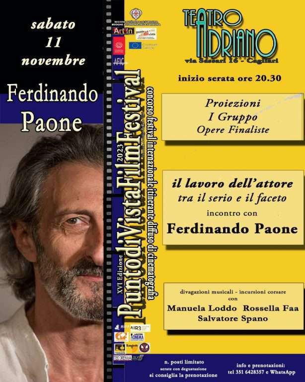 Sarà l’attore Nando Paone la guest star che sabato 11 novembre (Teatro Adriano, ore 20:30) inaugurerà la sedicesima edizione del PuntodivistaFilmFestival, il concorso internazionale di cinematografia organizzato dall’associazione culturale Art’In di Cagliari. L’attore napoletano sarà intervistato dal giornalista Giacomo Serreli, all’interno di una serata che prevede la proiezione del primo gruppo dei cortometraggi finalisti in concorso, le “incursioni corsare” delle attrici e cantanti Manuela Loddo e Rossella Faa, l’accompagnamento musicale del pianista Salvatore Spano.