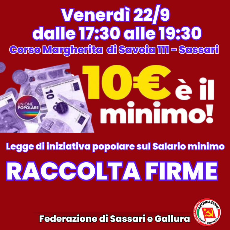 Nuovo doppio appuntamento con la raccolta firme per la Legge di Iniziativa Popolare per l’introduzione di un salario minimo di dieci euro organizzato dal Circolo di Rifondazione Comunista “Lidia Menapace” di Sassari.