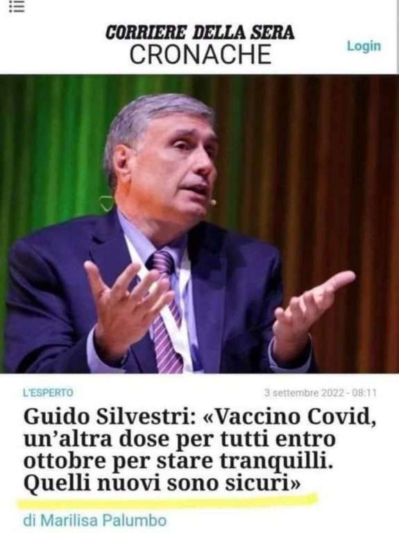 Guido Silvestri, direttore del dipartimento di patologia della Emory University di Atlanta, famoso immunologo e grande sostenitore delle politiche repressive per i non vaccinati, intervistato dalla giornalista Marilisa Palumbo del Corriere della Sera, afferma: “Vaccino Covid, un’altra dose per tutti entro ottobre per stare tranquilli. Quelli nuovi sono sicuri“.