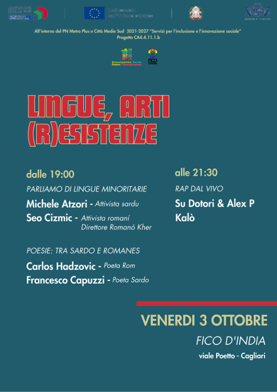 Un incontro tra culture, uno scambio di parole, poesie ed esperienze musicali: è ‘Lingue, Arti, (R)Esistenza’, evento che si terrà venerdì 3 ottobre a Cagliari. L’iniziativa è organizzata dall’Associazione Sarda contro l’Emarginazione (ASCE)nell’ambito del progetto PN Metro Plus e Città Medie Sud 2021-2027 (Priorità 4 “Servizi per l’inclusione e l’innovazione sociale” Progetto CA4.4.11.1.b Servizi per l’inclusione sociale e l’accompagnamento all’abitare per le comunità emarginate), realizzata in collaborazione con il Fico d’India e si svolgerà nel chiosco sul lungomare Poetto.