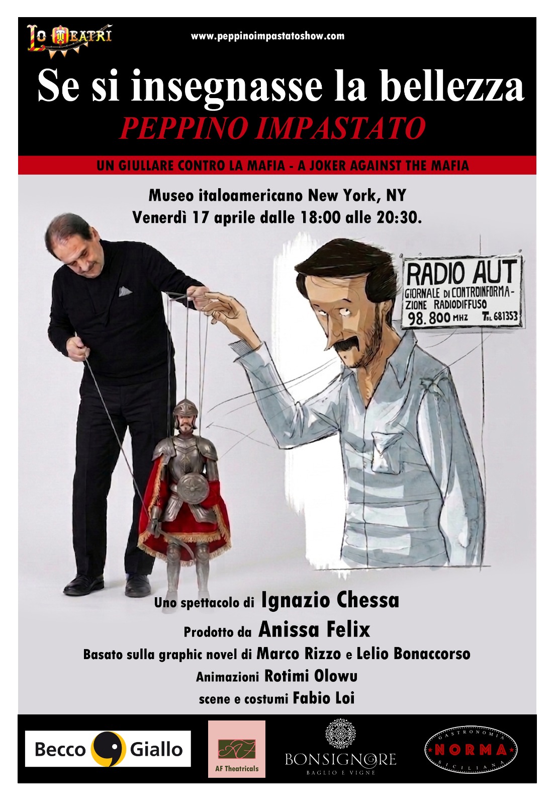 Il 17 aprile New York accoglierà nuovamente la potenza espressiva di Ignazio Chessa, attore e drammaturgo sardo che porterà nella metropoli americana “Se si insegnasse la bellezza”, spettacolo sul giornalista Peppino Impastato ucciso dalla mafia per aver denunciato i delitti criminosi da Radio Aut, l’emittente di controinformazione che fondò nel ’77 firmando la sua condanna a morte.