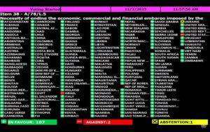 L’assemblea generale dell’Onu ha approvato nuovamente oggi a larghissima maggioranza una risoluzione per la fine dell’embargo economico e commerciale degli Usa contro Cuba, che dura da oltre sei decenni. La risoluzione è stata votata con il solo voto contrario di Stati Uniti e Israele e con l’astensione dell’Ucraina, tutto il resto del mondo ha votato a favore.