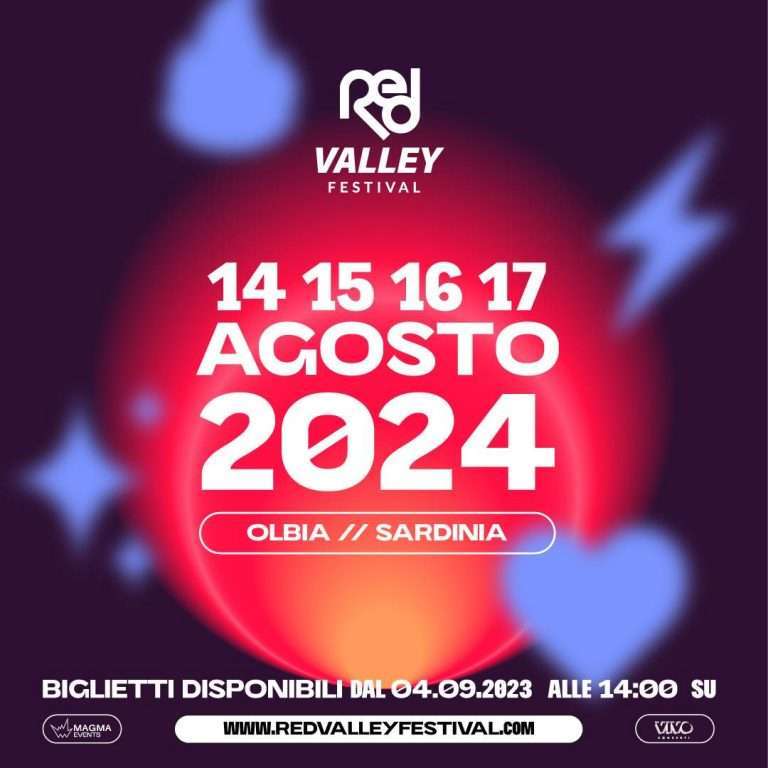 Dopo il successo da oltre 105 mila presenze ottenuto quest’estate per la settima edizione della manifestazione, svoltasi dal 12 al 15 agosto 2023 presso l’Olbia Arena (Olbia, SS) con più di 50 artisti protagonisti sul palco durante le quattro serate sold-out dell’evento, il Red Valley Festival è confermato anche per il 2024, con tante novità in arrivo nei prossimi mesi.