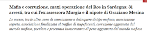 Maxi operazione del Ros in Sardegna: 31 indagati con l’accusa di associazione a delinquere di tipo mafioso, associazione segreta, associazione finalizzata al traffico di stupefacenti, abuso d’ufficio, rivelazione di segreto d’ufficio, corruzione aggravata dal metodo mafioso, peculato e procurata inosservanza di pena aggravata dal metodo mafioso.