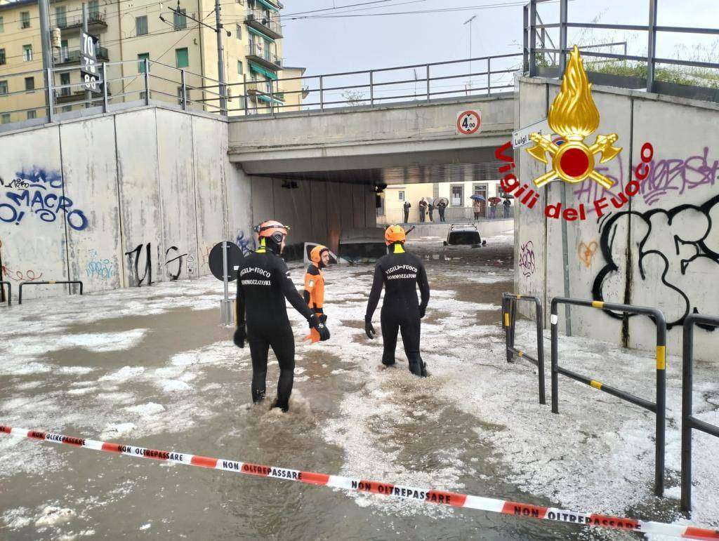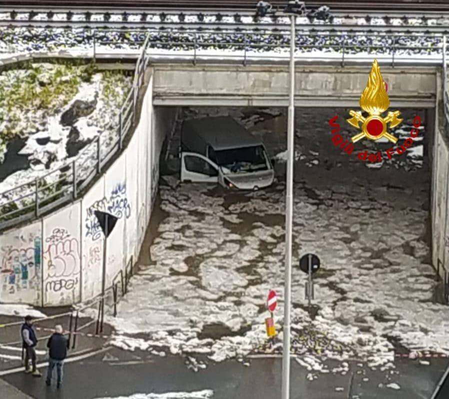 Nelle immagini i sommozzatori dei vigili del fuoco in azione nel sottopasso ferroviario di via Lanzi per due furgoni sommersi dall’acqua.