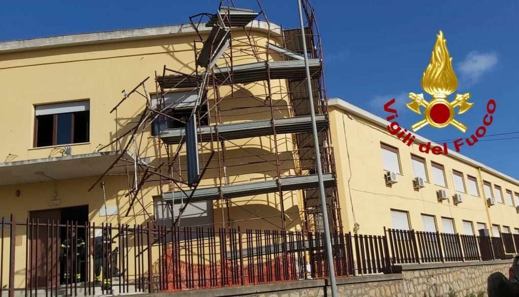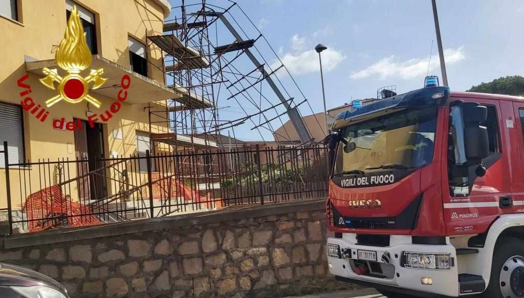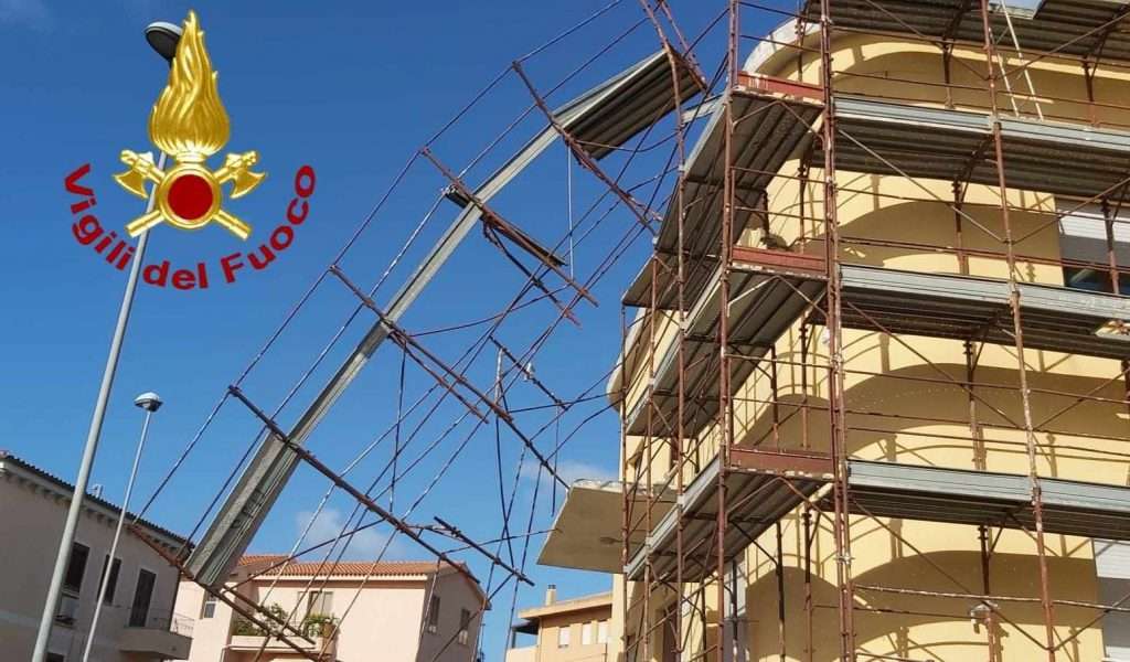Pali e insegne divelte, caduta parziale di cornicioni e messa in sicurezza di strutture pericolanti, come il cedimento dell’impalcatura nel cantiere edilizio presso l’istituto nautico in via Terralugiana a La Maddalena, a cui si riferiscono le immagini.