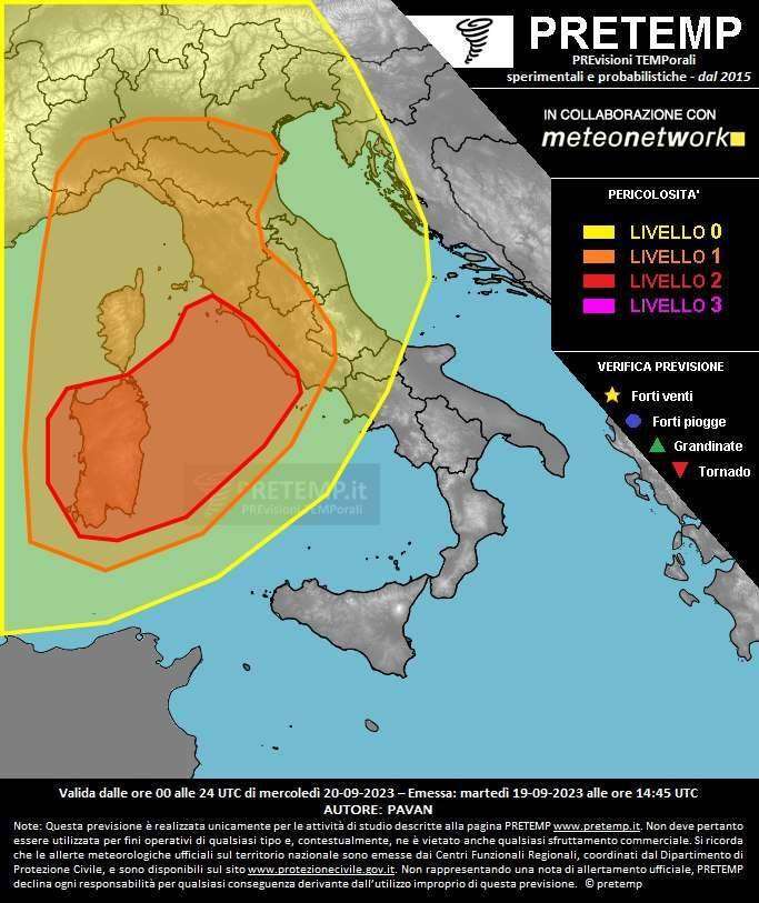 La sufficiente dinamicità della situazione sommata all’aria decisamente instabile consente l’emissione di un livello 2 per forti venti lineari e grandine anche di dimensioni medio-grandi sulla Sardegna ed il Mar Tirreno centrale, con un livello 1 per vento e nubifragi anche insistenti (senza escludere grandinate) fino all’Appennino e la pianura padana; in mare sono possibili trombe marine.