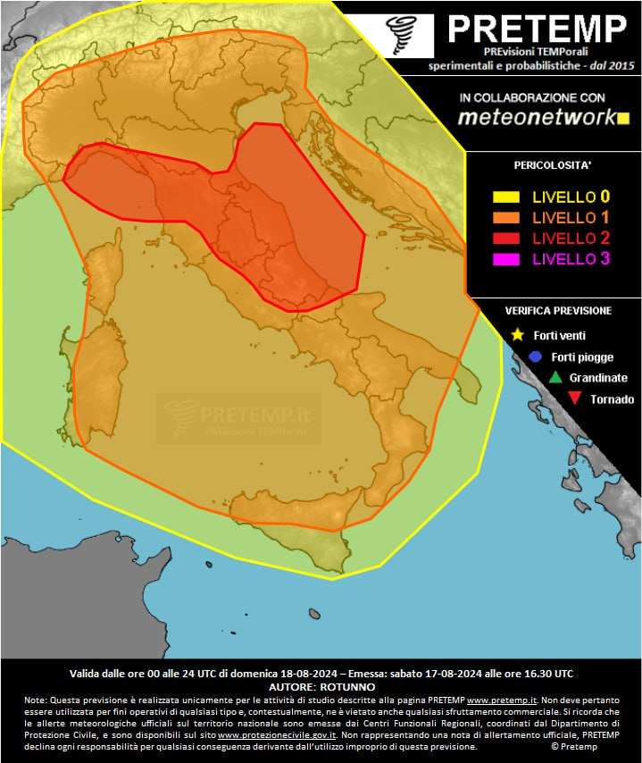 PRETEMP dirama un livello di pericolosità di livello 2, per la giornata di oggi, in Bassa Romagna, Marche, Abruzzo, Molise, Umbria, Lazio, Toscana e Liguria.