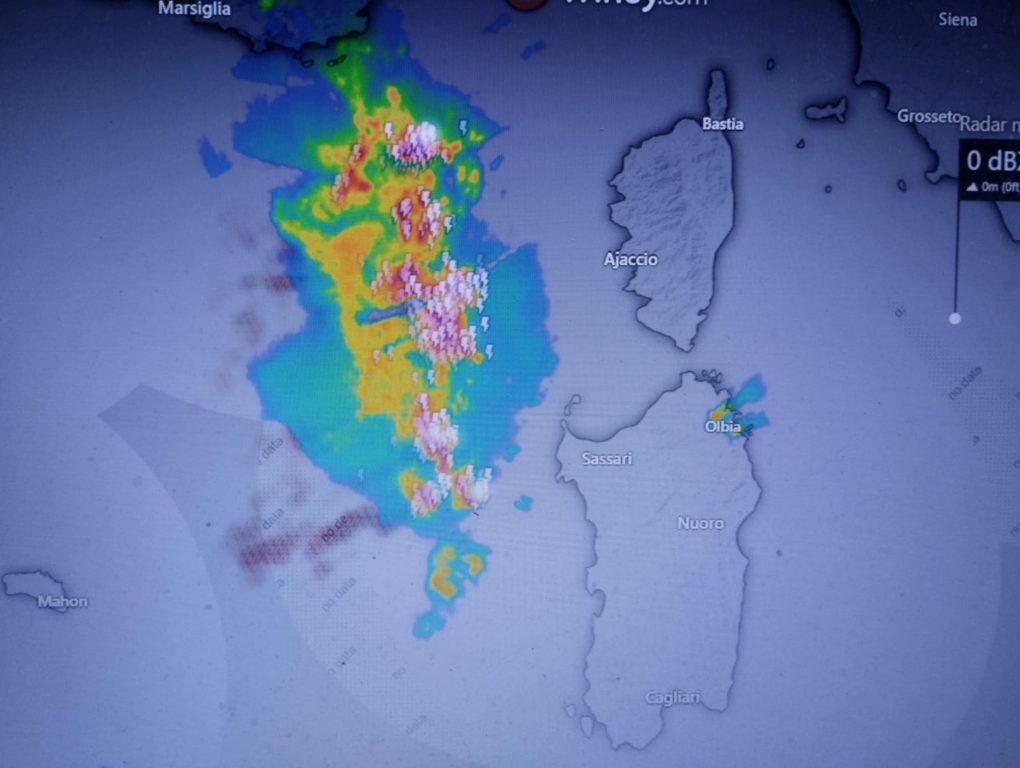 Una supercella temporalesca a “V” è in progressione dal mare di Sardegna verso Corsica e estremo nord della Sardegna, dalle informazioni in nostro possesso ha caratteristiche alluvionali e presenta fenomeni estremi.