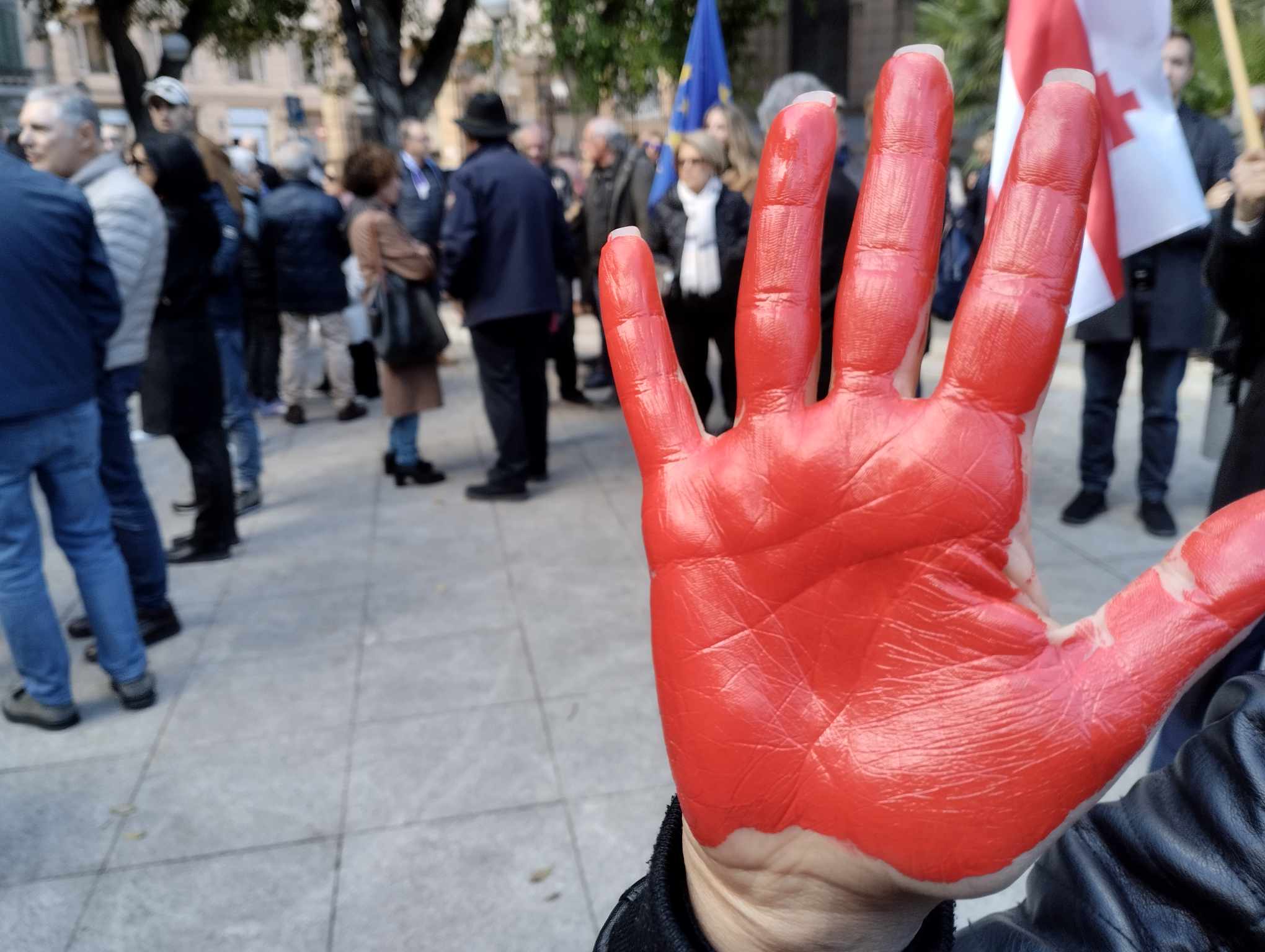 Presenti anche una 50ina di contestatori del piano di riarmo. Mani in alto “insanguinate”, tutte colorate di tinta rossa. E una scritta con i cartelli gialli: “Ripudio la guerra”.