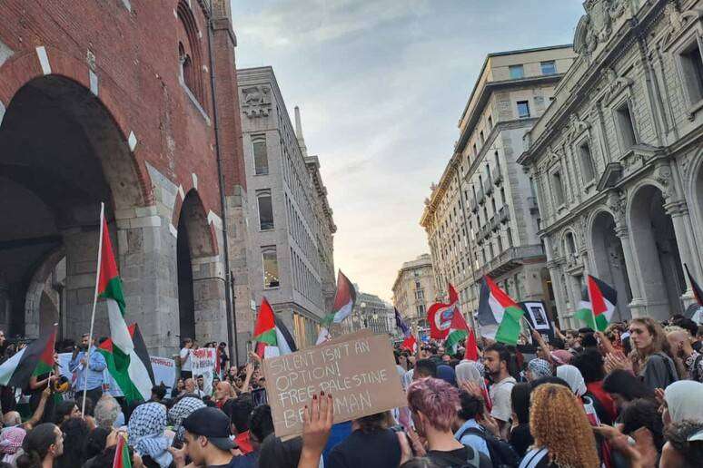 “Israele terrorista, Palestina libera” è il grido che si alza da piazza dei Mercanti, a Milano, dove alcune centinaia di persone si sono radunate per manifestare solidarietà alla causa palestinese.