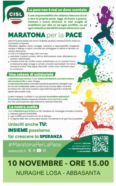 Una Maratona per la Pace, con iniziative in tutta l’isola: anche la Cisl sarda aderisce alla campagna nazionale lanciata dalla segretaria confederale Daniela Fumarola, e promuove momenti pubblici di riflessione, preghiera e testimonianza civile, in collaborazione con comunità locali, istituzioni, associazioni e realtà religiose. La prima tappa domani, giovedì 30 ottobre, alle 10, a Sassari, con un seminario sulla comunicazione nonviolenta, nella sede del sindacato. “Sono otto tappe – spiega il segretario generale Pier Luigi Ledda – che compongono un cammino condiviso, che si concluderà lunedì 10 novembre, al Nuraghe Losa di Abbasanta, alle 15, con una grande manifestazione regionale. Parteciperanno delegazioni provenienti da tutta l’isola, rappresentanti delle istituzioni sarde, delle comunità religiose e della società civile. Dopo un corteo verso il Nuraghe e un girotondo simbolico attorno al monumento, segno di unità e fraternità, la manifestazione si concluderà con un momento di riflessione comune all’interno della struttura”.