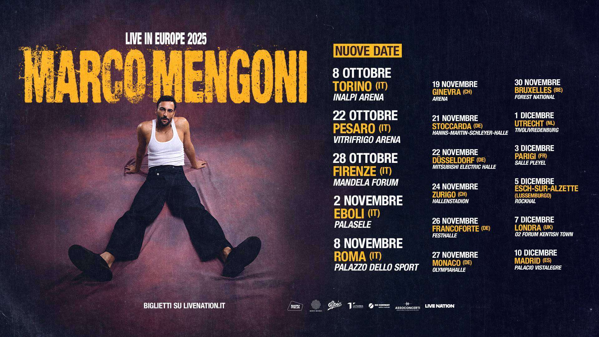 Il tour che porterà Marco Mengoni ad esibirsi nelle grandi arene europee in autunno si arricchisce di nuovi appuntamenti previsti nei principali palazzetti italiani, prodotti e organizzati da Live Nation. Il primo concerto della leg italiana si terrà a Torino (8 ottobre – Inalpi Arena), per poi proseguire a Pesaro (22 ottobre – Vitrifrigo Arena), Firenze (28 ottobre – Mandela Forum), Eboli (2 novembre – Palasele) e Roma (8 novembre – Palazzo dello Sport).