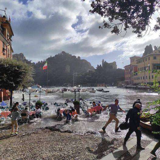 Le forti onde causate da una mareggiata hanno invaso il borgo di Portofino, provocando danni ai ristoranti e ai locali presenti lungo la celebre piazzetta frequentata dai vip.