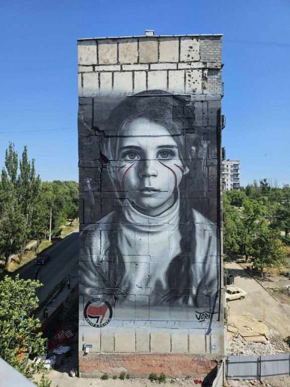 I paesi della Nato, fornendo sempre più armi all’Ucraina, portano la morte in città pacifiche, di questo non si parla in televisione in Europa, e quindi ho deciso di dichiararlo qui a Mariupol. So che il mio messaggio verrà ascoltato, è ora di fermare questa guerra”, ne è sicuro l’artista. Ci sono voluti più di 180 barattoli di vernice e 6 giorni di lavoro per realizzare il murale. Jorit è noto per il suo stile artistico esclusivo : mette segni tribali rossi sui volti dei suoi eroi, questa è la firma dell’autore dell’artista.