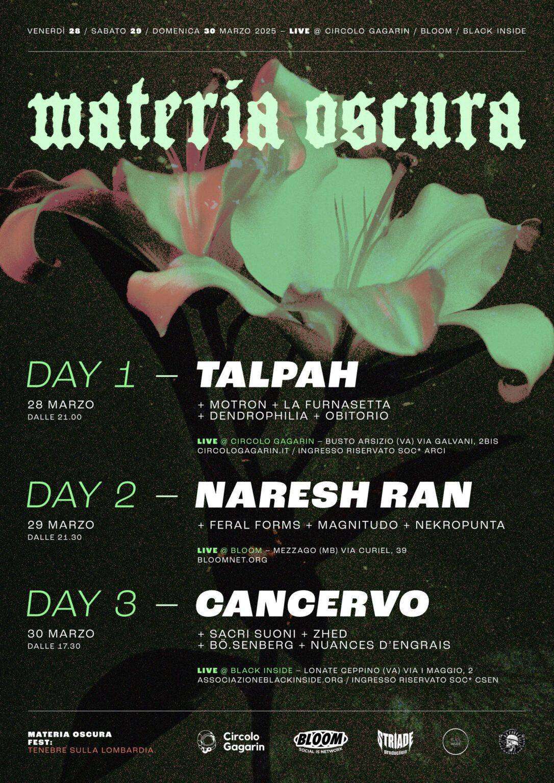 Circolo Gagarin, Bloom Mezzago e Black Inside. Per la prima volta tre pianeti instabili, scossi da perenni tormente e magma primordiale, si sono allineati. Come se la Terra fosse colpita da una furiosa tempesta solare, per un weekend (28-29-30 marzo) sulla Lombardia caleranno le tenebre: è il Materia Oscura Fest.