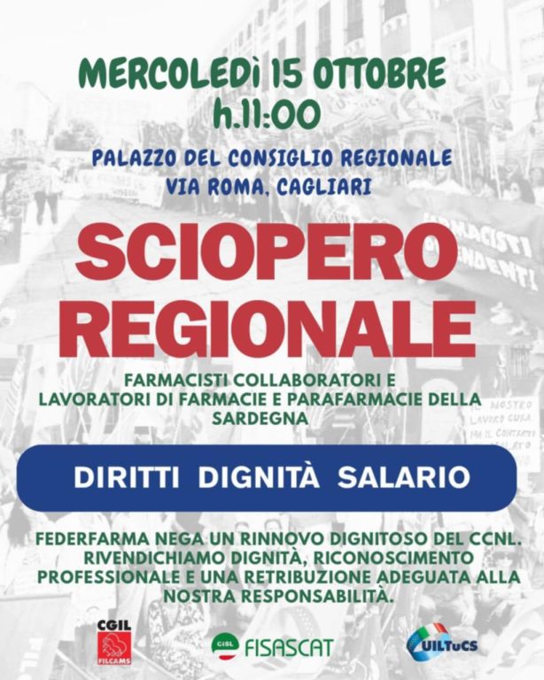Mercoledì 15 ottobre per l’intero turno di lavoro, si svolgerà uno sciopero generale del settore delle farmacie, che comprende farmacisti, collaboratori e lavoratori di farmacie e parafarmacie in Sardegna.