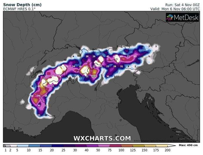 E’ arrivato un carico abbondante di neve, addirittura fino a un metro su alcuni settori alpini. Ma i fiocchi di neve si stanno vedendo anche a quote relativamente basse per il periodo, attorno ai 1000m, con locali sconfinamenti sino a 900m specialmente tra alta Lombardia e Trentino Alto Adige