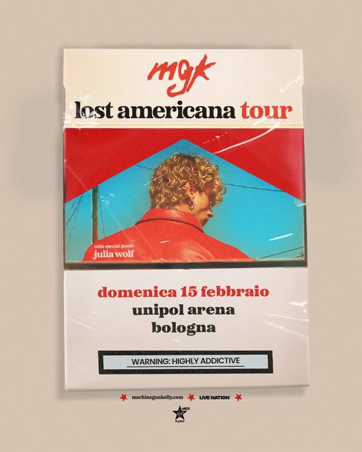Arriva in Italia Mgk con un nuovo grande appuntamento domenica 15 febbraio 2026 all’Unipol Arena di Bologna, in cui porterà, oltre ai suoi famosissimi brani di repertorio, il nuovo disco “lost americana”, uscito l’8 agosto.