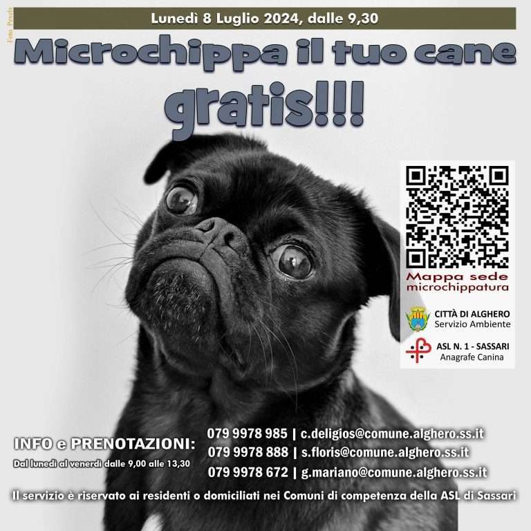 E’ stato fissato per il prossimo lunedì 8 luglio 2024 il nuovo appuntamento per la microchippatura gratuita dei cani nel comune di Alghero.