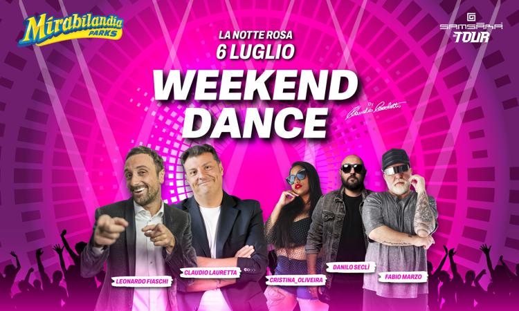 Torna l’attesissimo appuntamento con il Capodanno dell’estate della Riviera: la Notte Rosa. Sabato 6 luglio Mirabilandia presenta Weekend Dance, un evento esclusivo firmato da Claudio Cecchetto che farà ballare e divertire tutti i visitatori fino alle 23. Una serata molto speciale animata da un fantastico djset in collaborazione con il Samsara di Riccione, che vedrà alternarsi in consolle Danilo Saclì, Cristina Oliveira e Fabio Marzo. Sulle note delle hit estive, due squadre di ballerini professionisti si sfideranno in una Dance Battle tutta da seguire, in cui il supporto del pubblico farà la differenza.