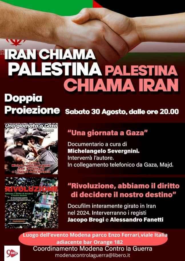 Sabato 30 dalle ore 20, a Modena presso il Parco Ferrari, nella zona adiacente al Bar Orange 182, si parlerà di Palestina ed Iran attraverso la proiezione di Docufilm molto recenti che daranno ai partecipanti una visione molto chiara della situazione che si stanno vivendo i popoli di queste due nazioni che sono tanto legate, pur non confinando geograficamente.