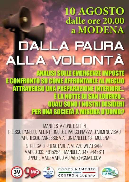 “Governare con la paura di una fase drammatica che incombe sembra essere diventato uno dei primi criteri utilizzati dalle classi politiche e dalle élites che determinano i destini dei paesi europei e di quell’occidente collettivo” che vive una crisi strutturale e forse definitiva”… “Questa sera dalle ore 20 presso l’anello interno del Parco Novi Sad si svolgerà un’iniziativa denominata “Dalla paura alla volontà”, promossa dai canali di informazione “Un ponte tra i mondi “e 9MQ, in collaborazione con 3V, le realtà locali di Ancora Italia Modena e Ferrara ed il Coordinamento Modenese contro la Guerra”, affermano gli organizzatori.