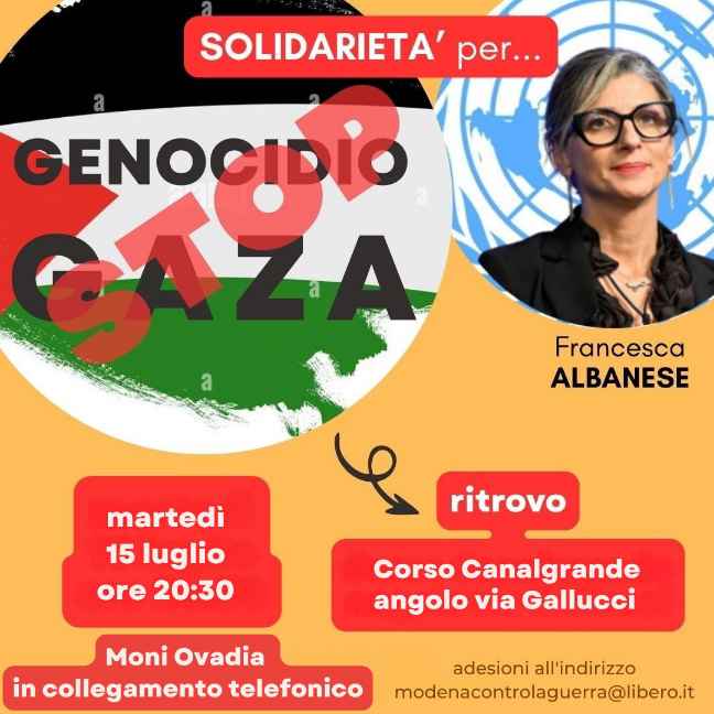 Martedì 15 alle ore 20:30  faremo un breve sit in per dimostrare la nostra solidarietà a Francesca Albanese, avremo anche il piacere di ascoltare un intervento di Moni Ovadia, in collegamento telefonico, il ritrovo é in Corso Canalgrande angolo Via Gallucci, i cittadini modenesi sono invitati a partecipare”, afferma il Coordinamento Modenese contro la Guerra