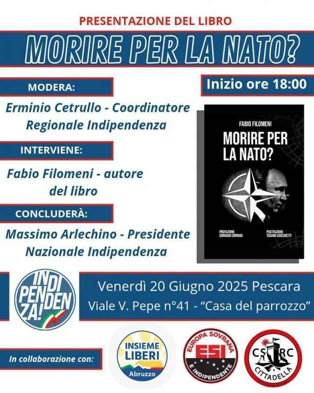 Venerdì 20 Giugno, dalle ore 18 presso la sala del caffè “Casa del parrozzo” in via V. Pepe 41 a Pescara, sarà presentato il libro “Morire per la Nato?”, per l’occasione sarà presente l’autore Fabio Filomeni e il presidente nazionale di Indipendenza, Massimo Arlechino.