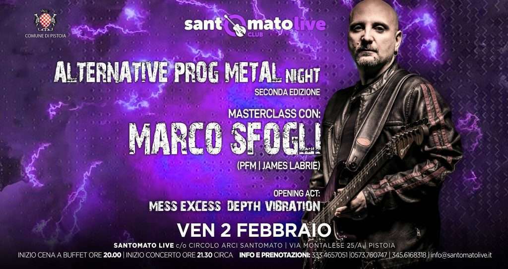 Ad accompagnare Marco Sfogli sul palco ci saranno i Depth Vibration e i Mess Excess, due band che trovano ispirazione nei suoni progressive rock/metal. I Depth Vibration, nati da una idea del chitarrista e compositore Giovanni Pedoto stanno per pubblicare il loro concept e i Mess Excess hanno rilasciato da poco il nuovo singolo “Ahab” in vista della pubblicazione del loro nuovo album.