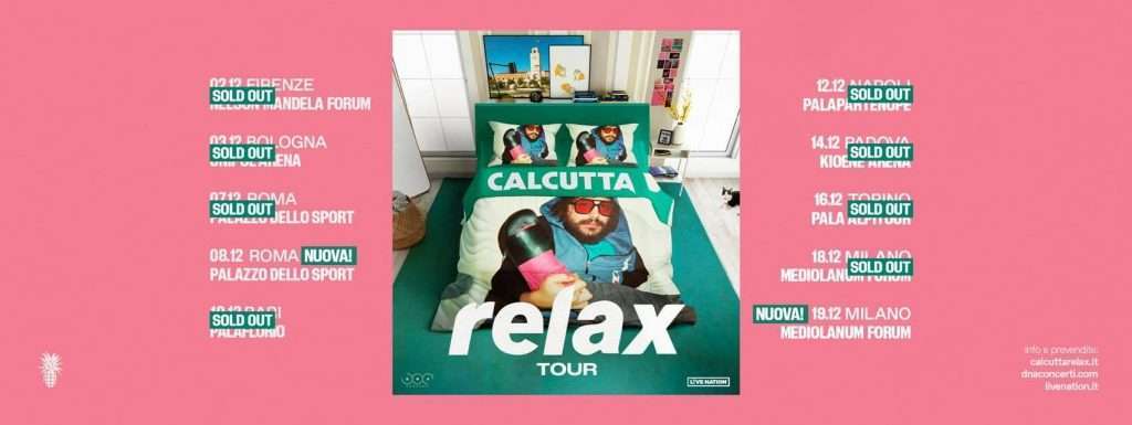 Calcutta annuncia oggi il raddoppio delle date di Roma (7 e 8 dicembre, Palazzo dello Sport) e di Milano (18 e 19 dicembre, Mediolanum Forum). Le due nuove date si aggiungono all’attesissimo Relax Tour, che ha registrato il sold-out delle prime otto date in pochissime ore.