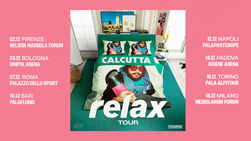 Calcutta annuncia il suo ritorno sui palchi con Relax Tour: otto concerti nei palasport delle principali città italiane, a distanza di quattro anni dagli ultimi live.
