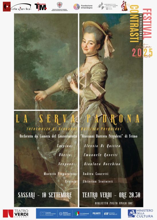Mercoledì 10 settembre, alle 20.30, al Teatro Verdi di Sassari andrà in scena”La Serva Padrona”, intermezzo di Giovanni Battista Pergolesi, in una coproduzione con la Cooperativa Teatro e Musica. A interpretare i ruoli principali saranno il soprano Alessia di Quirico nel ruolo di Serpina e il basso Emanuele Rosetti in quello di Uberto, con Gianluca Bocchino nei panni di Vespone, preparati dal maestro Andrea Concetti.