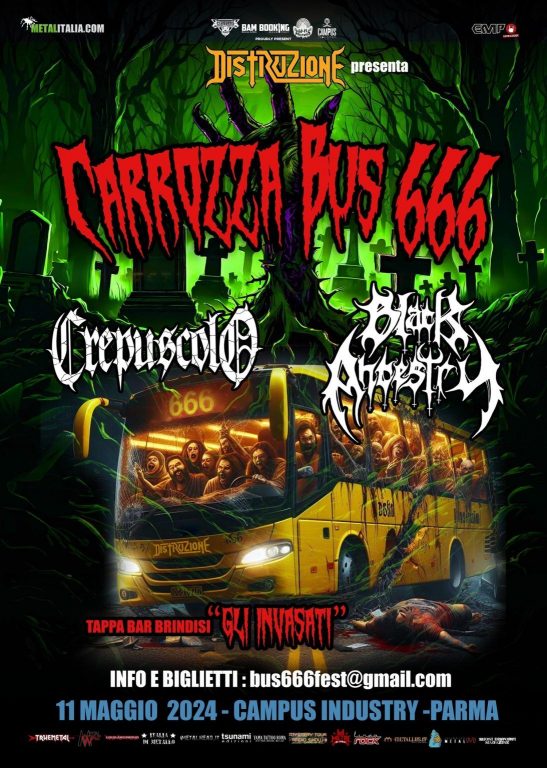 Torna anche quest’anno il Bus 666 per le strade di Parma, come di consueto saranno i Distruzione al timone di questo carrozzone demoniaco. Un vero e proprio autobus di linea che farà tappa in vari locali della città offrendo ai partecipanti cibo e bevande, per poi culminare in uno degli eventi più attesi di questa stagione: il “Rise From The Grave”, evento dedicato al death metal con Dismember, Vomitory, Distruizione, Pessimist, Cadaveric Crematorium, Dead Chasm.