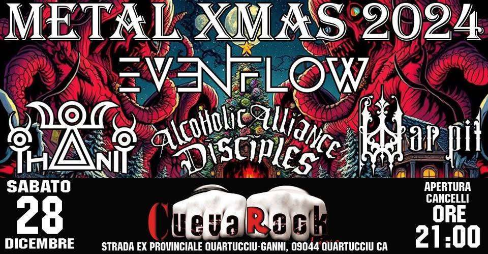 L’evento metal natalizio vedrà sul palco della Cueva Rock Live alcune tra le band più importanti della scena sarda, infatti, con apertura dei cancelli alle 21, il 28 dicembre saliranno sul palco gli Even Flow – Power Metal band di Sassari, la Southern Metal band cagliaritana degli Alcoholic Alliance Disciples, i nuoresi Thanit che fanno Symphonic Metal e sempre da Cagliari i War Pit, che suonano un genere da loro definito Nuragic Metal.
