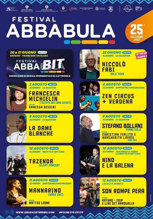 L’edizione 2023 di Abbabula, organizzata in collaborazione con la società Shining Production e la Roble Factory per l’Alguer Summer Festival, si conferma come uno degli appuntamenti più importanti dell’isola e si inserisce nel cartellone estivo di Alghero Experience. Il festival è organizzato grazie al contributo del Ministero per i Beni e Attività Culturali, dell’Assessorato della Cultura e quello del Turismo della Regione Sardegna, della Fondazione di Sardegna, della Fondazione Alghero e con il patrocinio del Comune di Alghero e di Sassari.