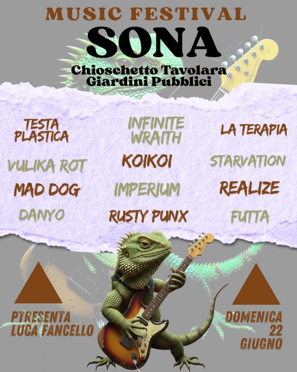 La terapia, Realize, Testa plastica, Infinite wraith, Vulika ROT, Danyo, Imperium, KoiKoi, Stravation e Mad Dog: 10 band, nuova e giovane generazione di ragazze e ragazzi che approcciano la musica abitando il presente, ispirandosi a volte al passato e proiettandola nel futuro. Loro gli attesissimi protagonisti della prima edizione di SONA – Music festival, festival “dell’emergenza” inteso come l’atto di emergere, come plauso a chi ha scelto di emergere dall’omologazione ed è tornato in saletta a provare con il sogno (realizzato) di suonare su un palco fronte pubblico. Accadrà a Sassari domenica 22 giugno a partire dalle ore 12, nel verde dei giardini pubblici – spazio Chioschetto Tavolara e coordinamento a cura dell’Associazione Ugcom – realtà che punta sulla città e sulla musica per raccontare la sua storia e farsi ascoltare. A battezzare l’esordio del festival, in chiusura di serata, due nomi noti della scena sassarese, Futta (che collabora alla realizzazione dell’evento) e i Rusty Punx: non un passaggio di consegne ma un vero e proprio incitamento a ri-generare un movimento che a Sassari, negli anni, ha generato grande musica e bravi musicisti.