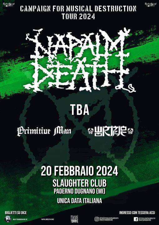 La band di Birmingham non ha bisogno di presentazioni ed è pronta a infiammare di nuovo il palco dello Slaughter Club. In Questo tour saranno accompagnati dagli Wormrot (Singapore) e dagli americani Primitive Man, in attesa di scoprire la band “bomba” che accompagnerà i Napalm Death in questo fantastico tour.