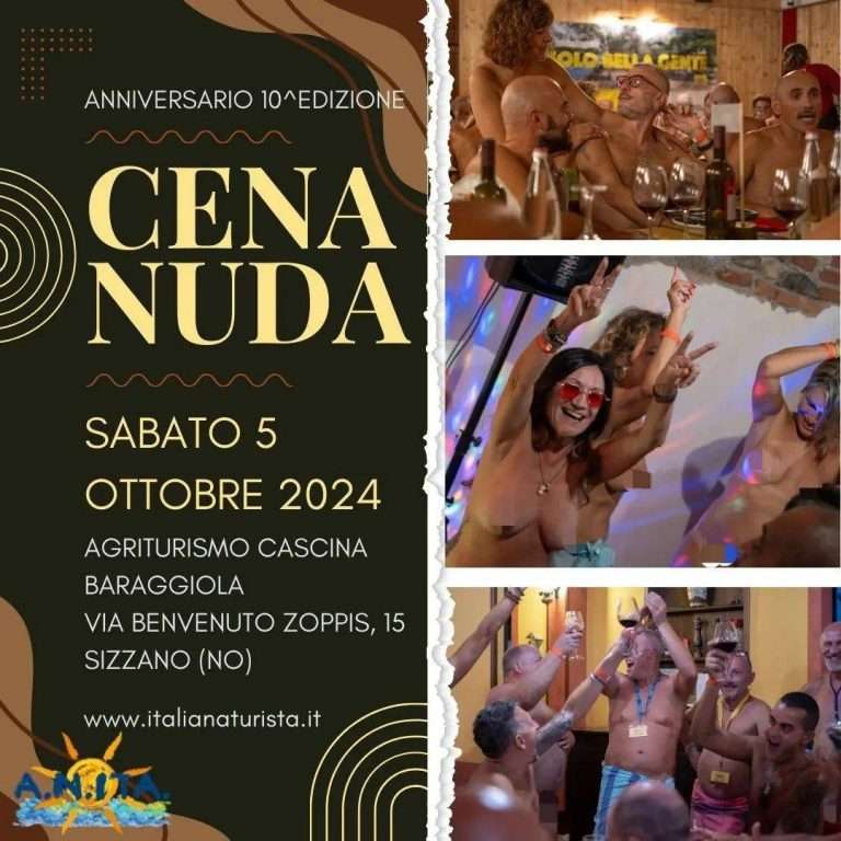 La cena è aperta a tutti i soci naturisti, simpatizzanti e aspiranti naturisti, si svolgerà in completa nudità, ma è obbligatoria una salvietta per sedersi e ciabatte, e per venire incontro alle persone che vorranno “provare per la prima volta questa esperienza” sarà possibile tenere indosso un semplice pareo o telo, la cena sarà accompagnata da musica e balli.