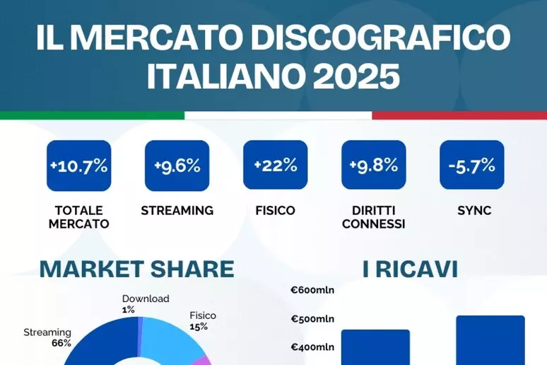l mercato discografico italiano continua il suo percorso di crescita per l’ottavo anno consecutivo: nel 2025 i ricavi complessivi raggiungono infatti la cifra record di 513,4 milioni di euro, in aumento del 10,7% rispetto al 2024 – il doppio in comparazione al 2019.