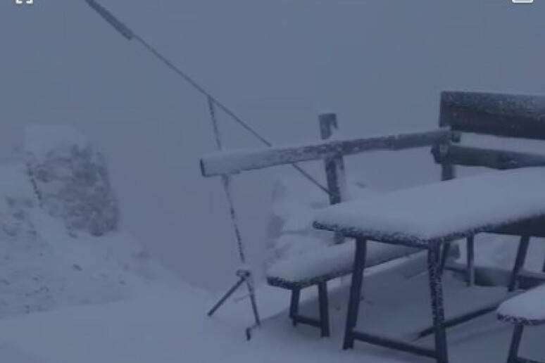 Ai 3.334 metri della capanna di Punta Penia, il rifugio gestito da Carlo Budel, si misuravano stamane 10-15 centimetri di neve fresca, e temperatura sotto lo zero.