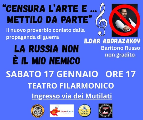 “‘Censura l’arte e…mettilo da parte”, potrebbe essere questo il nuovo proverbio della propaganda di guerra”, affermano in una nota alcune associazioni veronesi che contro la decisione di censurare il baritono russo Ildar Abdrazakov hanno annunciato per il 17 una manifestazione.