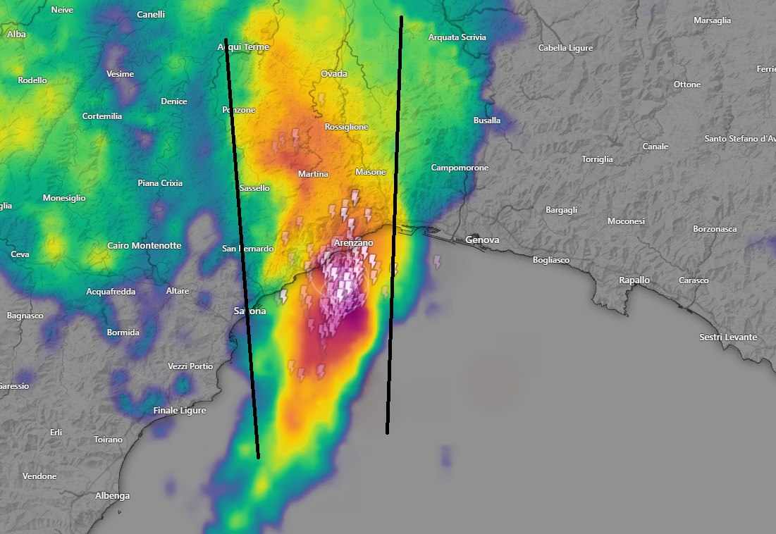 Le precipitazioni continuano ad insistere tra Cogoleto e Varazze con quantitativi raggiunti di 75,8 mm in un’ora a Sciarborasca (con intensità massima raggiunta di 10,40 mm in 5 minuti )