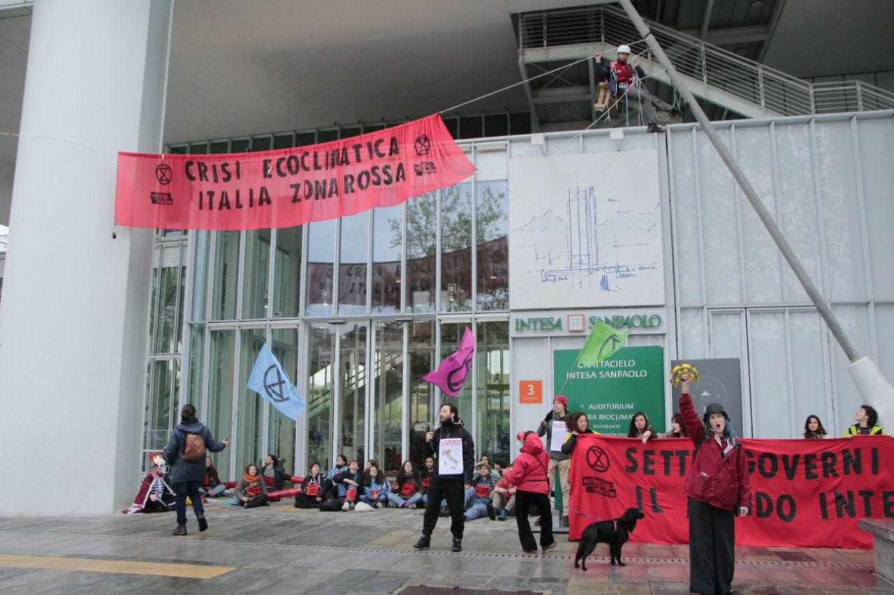 A poche ore dall’inizio di una zona rossa di quattro giorni per ospitare il G7 su Clima Ambiente e Energia, Extinction Rebellion ha occupato il Grattacielo Sanpaolo, la sede della banca.