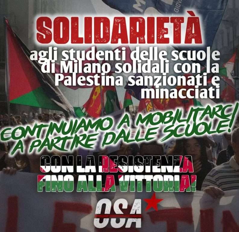 “In questi giorni stanno arrivando notizie gravi di atti di repressione nei confronti di studenti delle scuole di Milano che stanno esprimendo solidarietà alla resistenza palestinese dopo le minacce ricevute settimana scorsa.