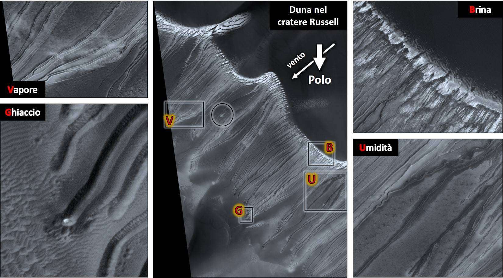 “I linear gullies potrebbero essere formati dalla brina che, grazie alle immagini della sonda Mars Reconnaissance Orbiter, abbiamo evidenziato sulla cima della duna Russell. La superficie del pendio è ondulata lateralmente e, quando i canali restano in penombra, si osservano tracce di umidità assorbita dalla sabbia. Viceversa, quando un canale svolta in direzione della luce, si assiste all’immediata evaporazione dell’acqua che si era conservata liquida fino a quel punto”.